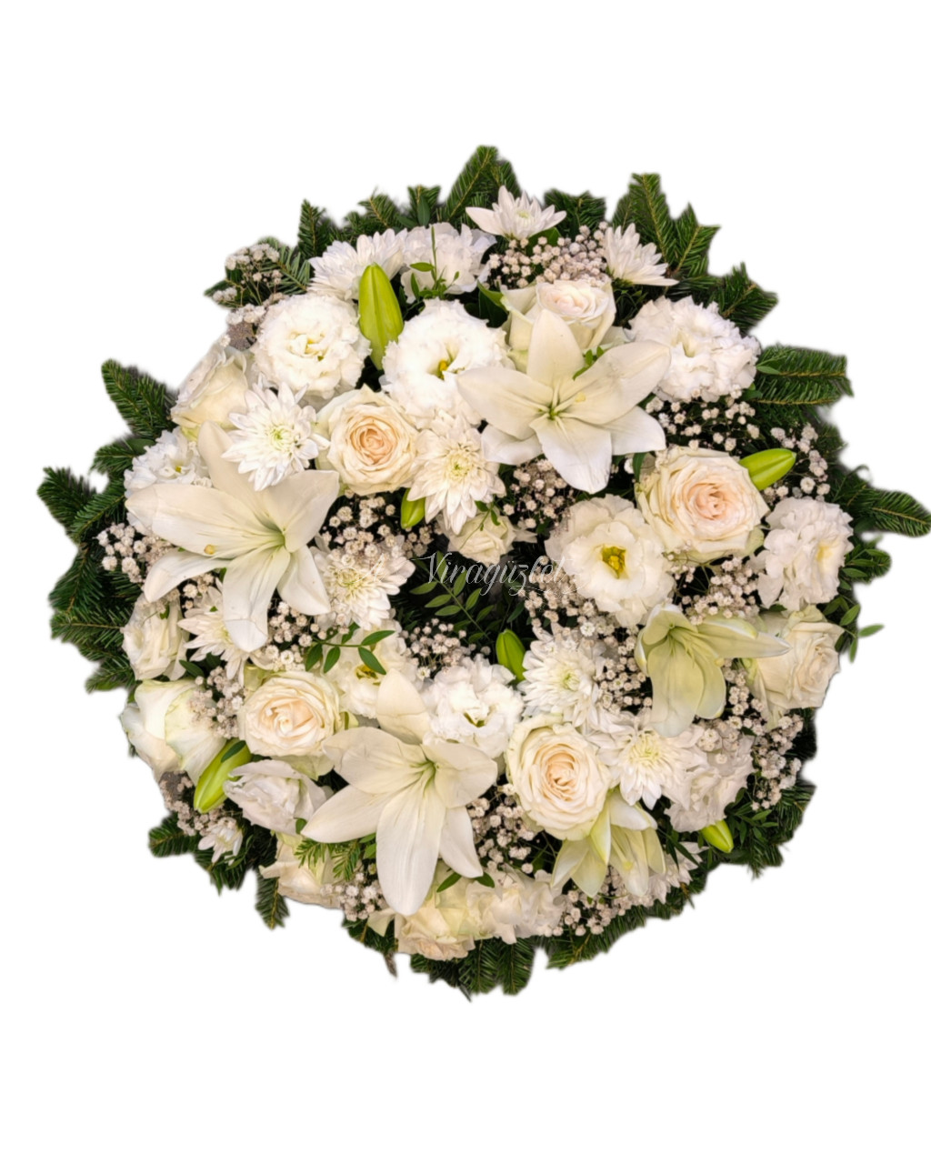 Fehér liliommal készített görögkoszorú. A méltó bucsuzás dísze